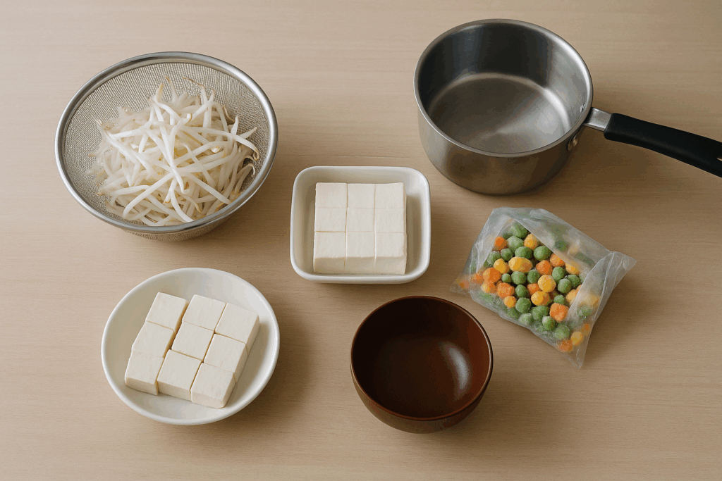 主役はもやし(1袋)、豆腐(木綿or絹 1〜2丁)、冷凍野菜(ミックス・ブロッコリー・ほうれん草など)。あとは家にある調味料と乾物(わかめ・春雨・とろろ昆布)、卵や缶詰が少しあれば充分。塩分は最後に“ちょい足し”で整えると失敗しにくいよ。