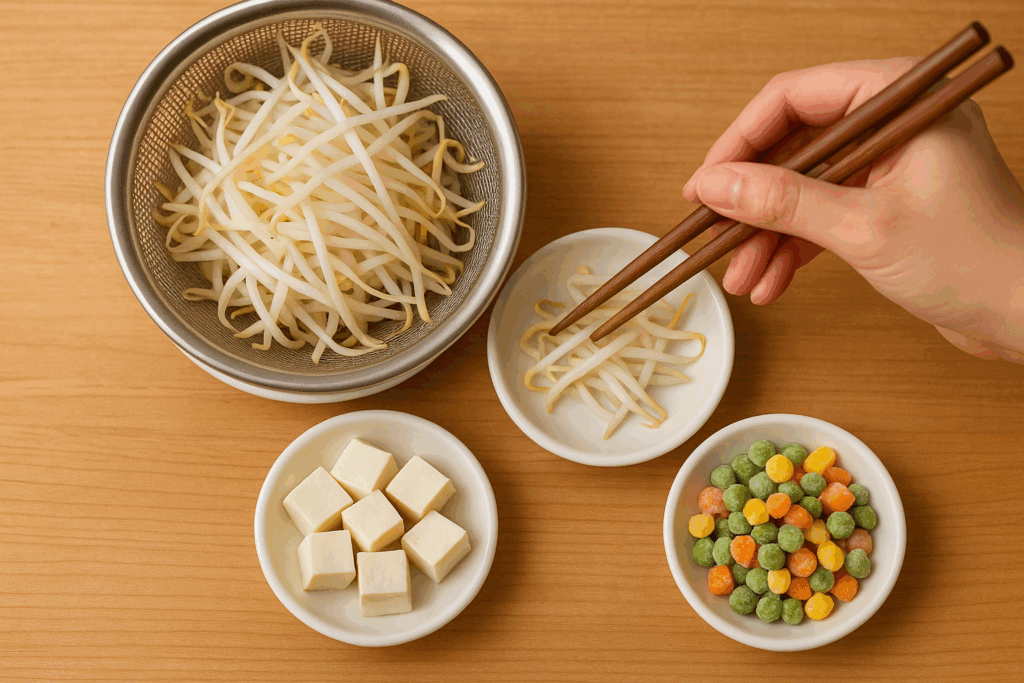 もやし:さっと洗って水気を切るだけ(シャキ感キープ)。