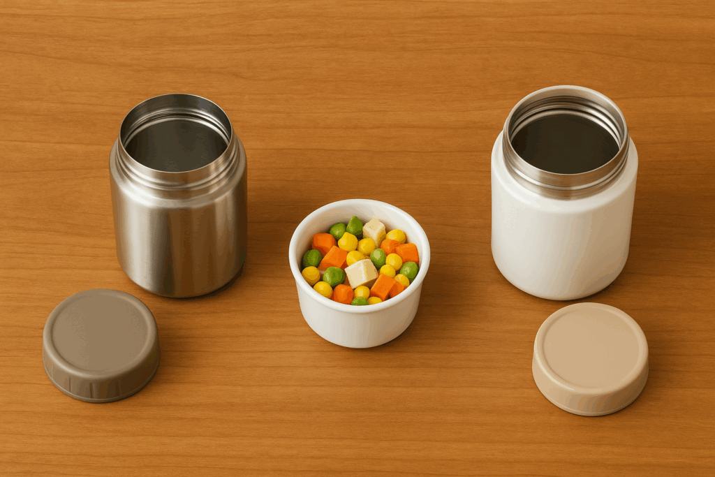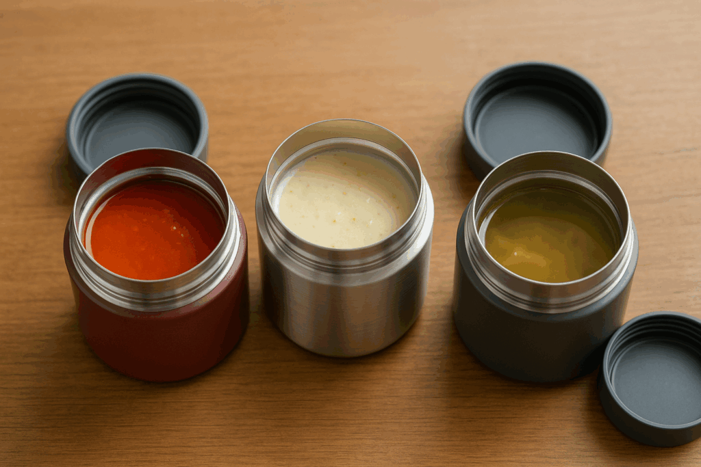 300〜400mlの広口が食べやすくて洗いやすい。保温性はフタ構造も大事だから、パッキンがしっかりしたモデルを。スプーンは長めを選ぶと、具だくさんでも食べやすいよ。