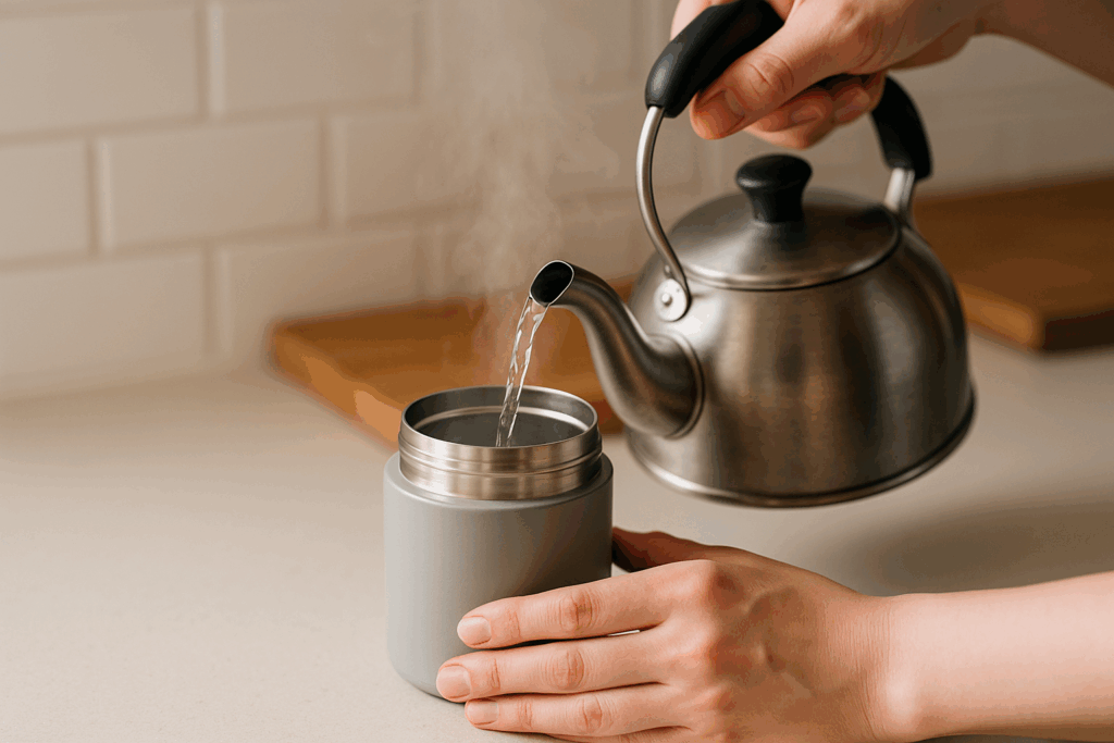 ①ジャーに熱湯を満水(3〜5分予熱)→②具材を加熱(電子レンジ or 鍋)→③湯を捨て、95℃級の熱々を注いで満たす→④すぐ密閉。これで昼まで“あったか”持続だよ。